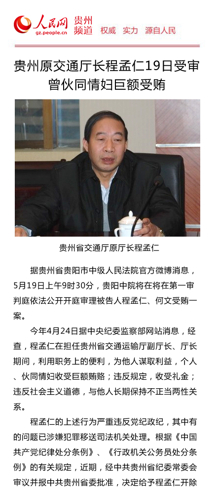 貴州省交通廳原廳長程孟仁今日貴陽中院受審