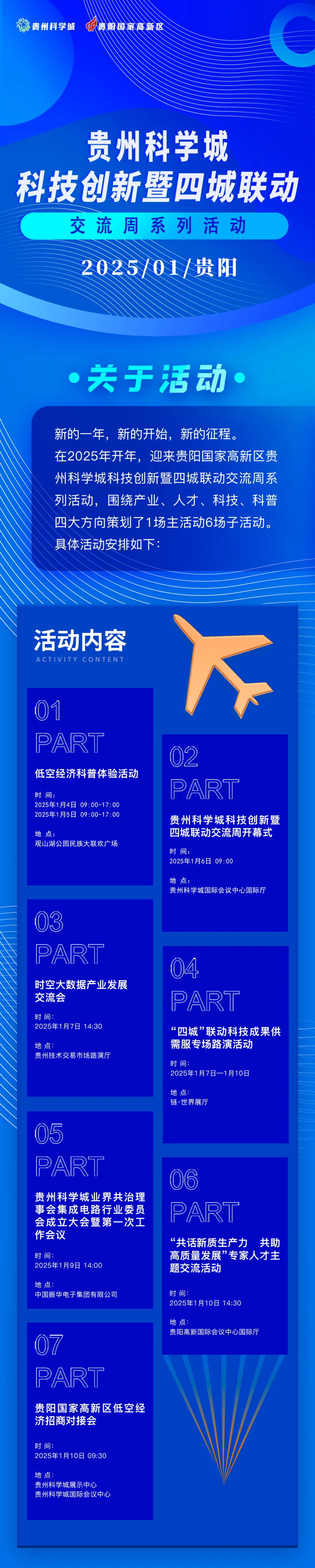 1月4日至5日,貴州科學城科技創新暨四城聯動交流周系列活動之低空經濟科普體驗活動將在觀山湖公園民族大聯歡廣場舉辦。 此次活動為期兩天,活動期間,來自貴陽高新區、觀山湖區、雙龍經開區以及成都高新區的10余家低空經濟企業,將為廣大市民群眾展現各自的“看家本領”,與全民共赴一場低空經濟的科普之旅。 據了解…[詳細]