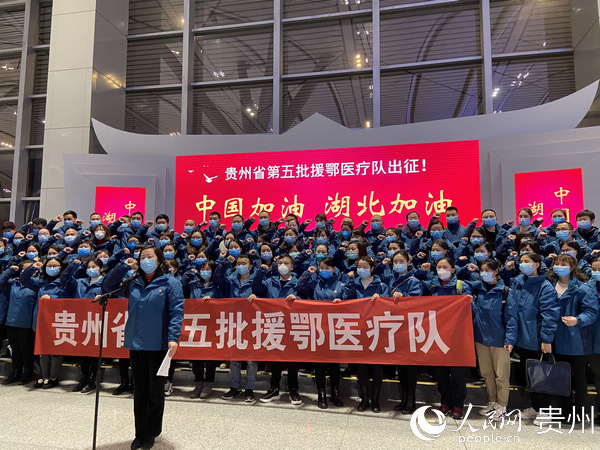 第五批援鄂醫療隊隊長、貴州中醫藥大學第二附屬醫院黨委書記張敬杰在機場帶領全體出征醫護人員宣誓出征。
