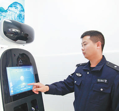 織金縣珠藏鎮警務助理肖發陽在展示智能機器人如何使用。本報記者 黃 嫻攝