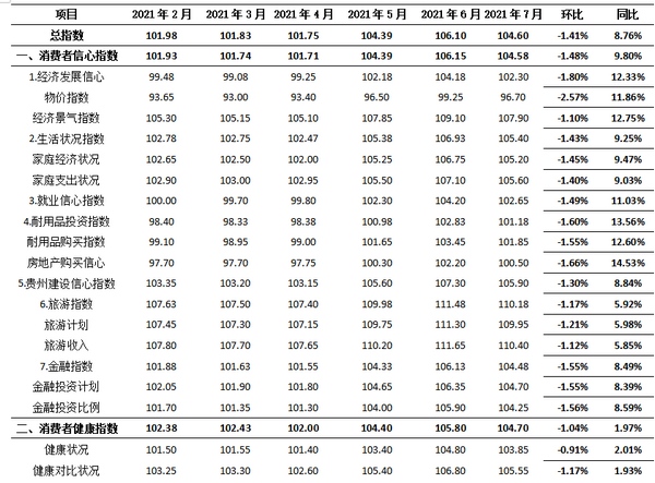 消費者信心各細分指數方面,呈現環比下降、同比上升特點。2021年7份,消費者信心指數為104.58點,環比下降1.48%,同比上升9.80%。