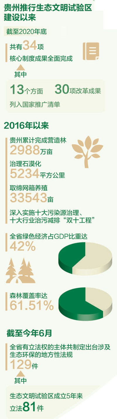貴州守好發展和生態兩條底線。截至2020年底,試驗區34項核心制度成果全面完成,其中13個方面、30項改革成果列入國家推廣清單,貴州省綠色經濟占GDP比重達42%,森林覆蓋率達61.51%。