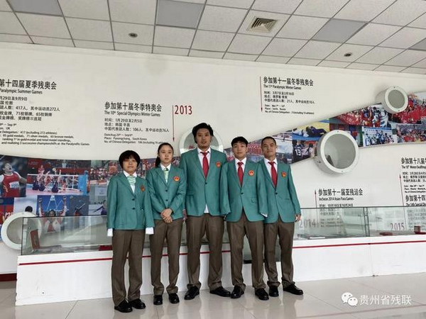 貴州省游泳代表隊合影(從左到右:劉道敏、蔡麗雯,教練周廣慈,楊洪、楊光龍)。貴州省殘聯提供