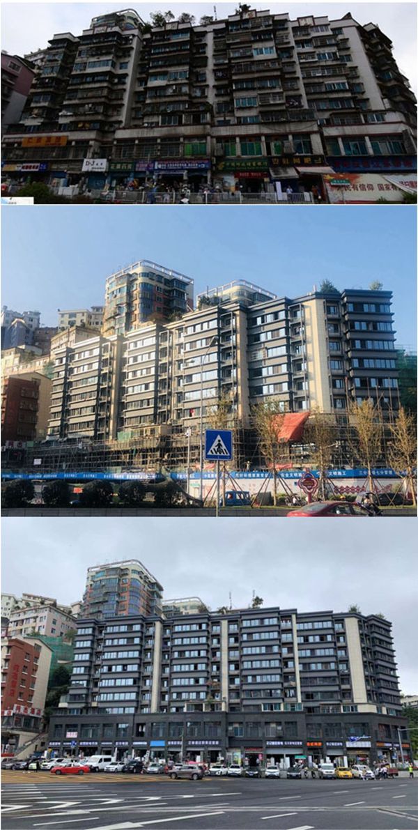 貴陽市云巖區老舊小區改造前(上)改造中(中)改造后(下)拼版對比圖。貴陽云巖康廈城市開發建設公司供圖