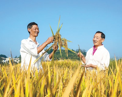 代遠富(左)和村民在田間查看即將收割的稻谷。