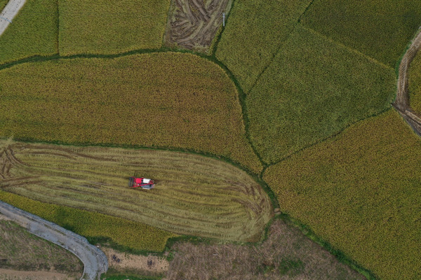 金沙縣禹謨鎮收割機收割水稻航拍。何志剛攝