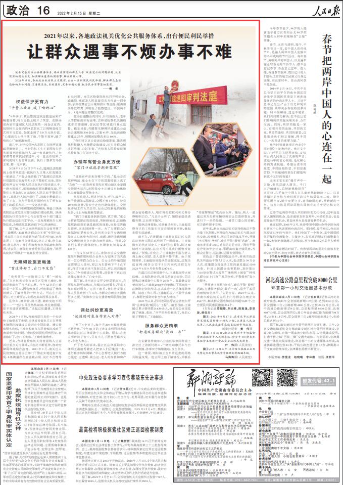 2021年以來,各地政法機關既立足眼前,出臺一系列便民利民舉措,解決群眾急難愁盼的具體問題;又著眼長遠,系統謀劃,完善體制機制,把為民辦實事落細落實。