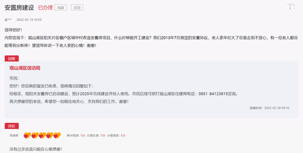 看到留言后,觀山湖區信訪局就網友關心的問題回復稱,現陽關安置房已啟動建設,預計2025年完成建設并投入使用。為方便后續咨詢,此次回復還公布了觀山湖區住建局的聯系電話。