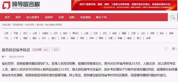 3月12日,務川自治縣發現一例輸入性新冠肺炎確診病例,截至3月17日18時,疫情已累計報告9例感染者,涉及5個家庭。3月14日起,務川對全縣各鄉鎮、街道、社區行政轄區范圍的交通等進行管控,后續管控措施將視疫情防控情況及時調整。受該輪疫情影響,多名將在近期參加貴州省考的考生在人民網“領導留言板”向貴州省長留言。
