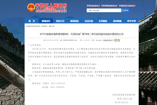 平壩區新冠肺炎疫情防控領導小組辦公室已發布公告,對鼓樓街道希望城第6棟、紅湖機械廠第70棟二單元居民樓實施臨時管控,所有人員只進不出,嚴格居家健康監測。臨時管控實施期間將安排醫護人員開展核酸檢測,解除時間根據疫情發展情況另行通知。