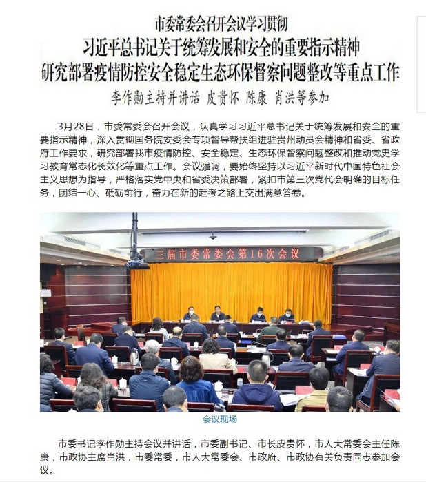 3月28日,認證主體為中共銅仁市委宣傳部的微信公號“微銅仁”報道,市委常委會召開會議,市委書記李作勛主持會議并講話