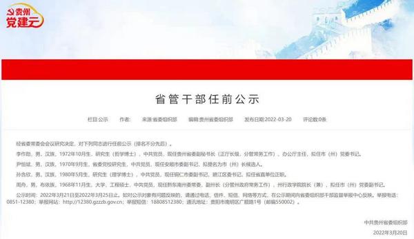 根據中共貴州省委3月20日發布的“省管干部任前公示”顯示,李作勛,男,1972年10月生,研究生(哲學博士),中共黨員,現任貴州省委副秘書長(正廳長級,分管常務工作)、辦公廳主任,擬任市(州)黨委書記。公示時間為2022年3月21日至2022年3月25日,目前公示期已結束。