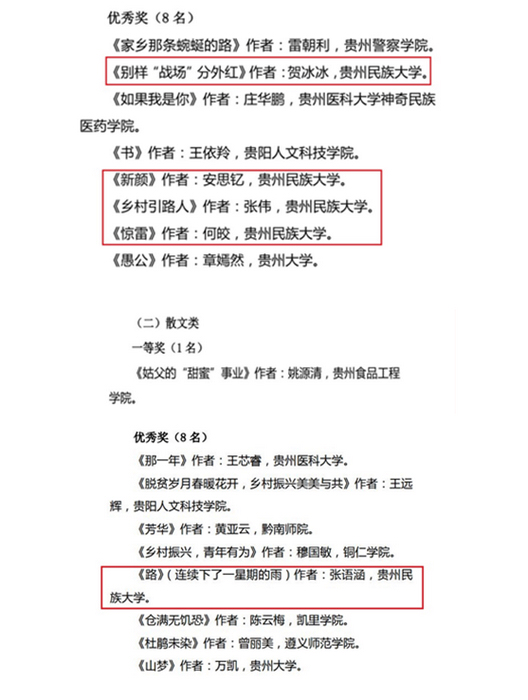 近日,貴州省高校鄉村振興研究中心對“貴州省高校鄉村振興詩歌、散文創作大賽”獲獎作品進行公示。貴州民族大學學子的作品榮獲多個獎項。其中,涂偉榮獲詩歌類一等獎,韋代江、吳國芬榮獲詩歌類二等獎,王鑫盈榮獲詩歌類三等獎,賀冰冰、安思釔、張偉、何皎榮獲詩歌類優秀獎,張語涵榮獲散文類優秀獎。