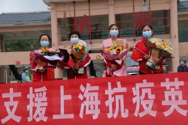 “同心守‘滬’,平安凱旋,歡迎回家!苯,援滬醫療隊員抵達納雍收費站,翹首等待的家人、同事、朋友,一一向她們獻上鮮花、掌聲,并與她們深情相擁。迎接的縣領導,向守“滬”30天的她們致以崇高敬意和誠摯問候。