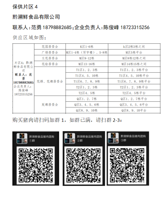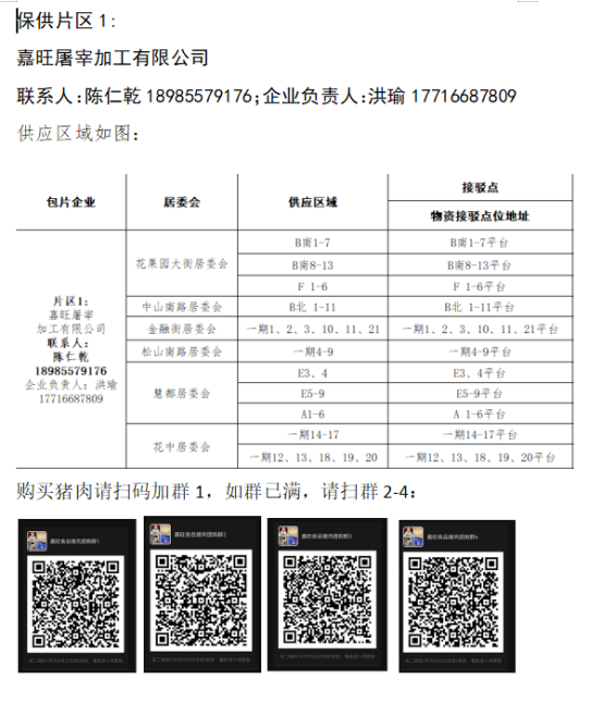 花果園片區將劃定5個售賣區域,每家售賣企業負責一個區域內豬肉點對點供應。居民如有需求,可根據自己居住的區域掃碼入群,定向下單。企業在接到訂單后將嚴格按照高、中、低風險區物資配送流程,全面實現無接觸配送。(文/圖?王麗霞)