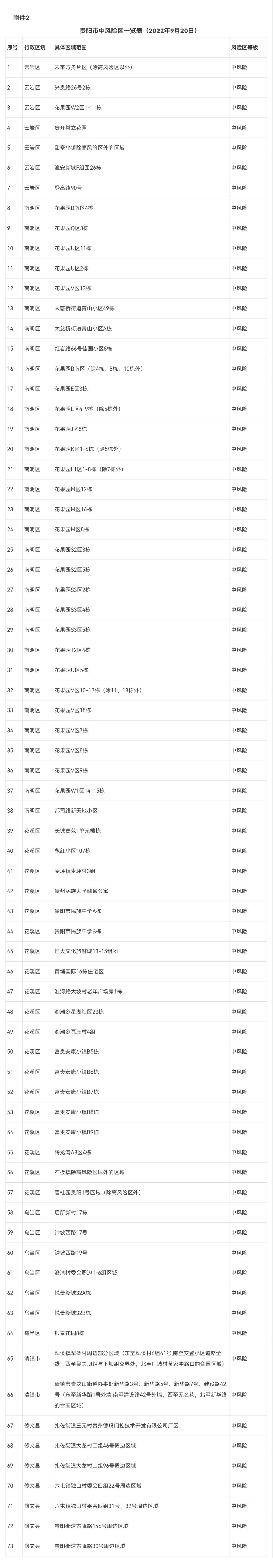 2.貴陽市中風險區一覽表(2022年9月20日)