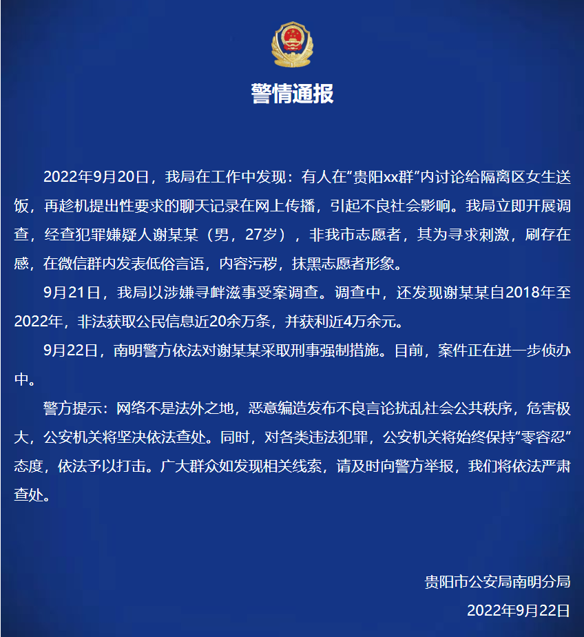 9月22日,謝某某因涉嫌侵犯公民個人信息罪被依法刑事拘留。對其發表低俗言語,抹黑志愿者形象,在網絡上造成不良影響的行為,南明公安分局以涉嫌尋釁滋事受案調查,案件正在進一步偵辦中。