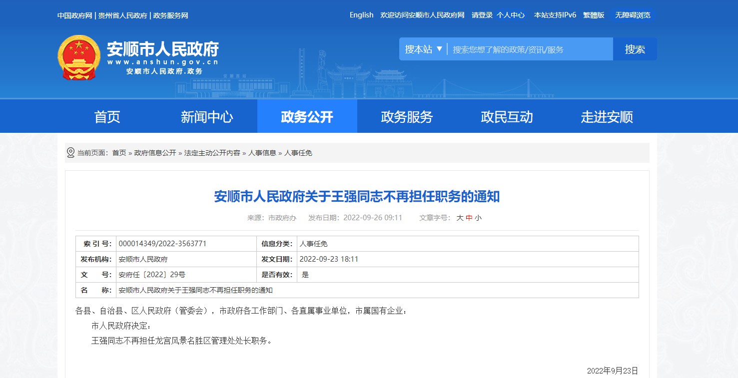 王強同志不再擔任龍宮風景名勝區管理處處長職務。