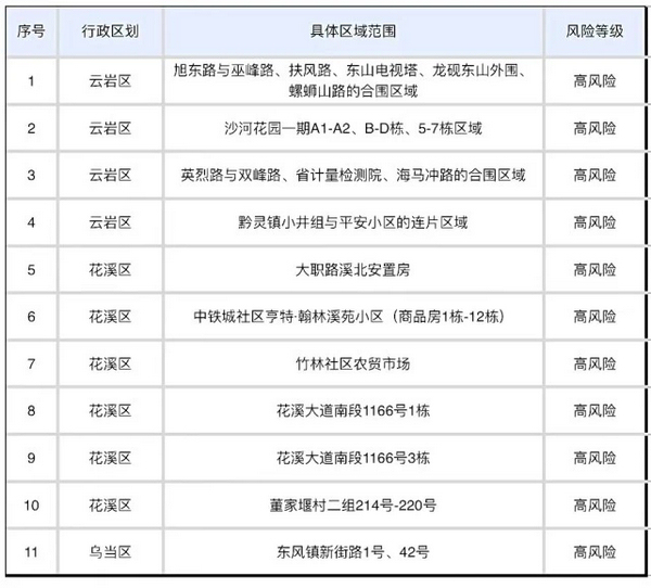 云巖區:1.中華北路與延安中路、人民大道、黔靈西路的合圍區域;2.浣沙巷2號香獅華龍商住樓;3.北京西路與棗山路、英烈路、雙峰路的合圍區域。
