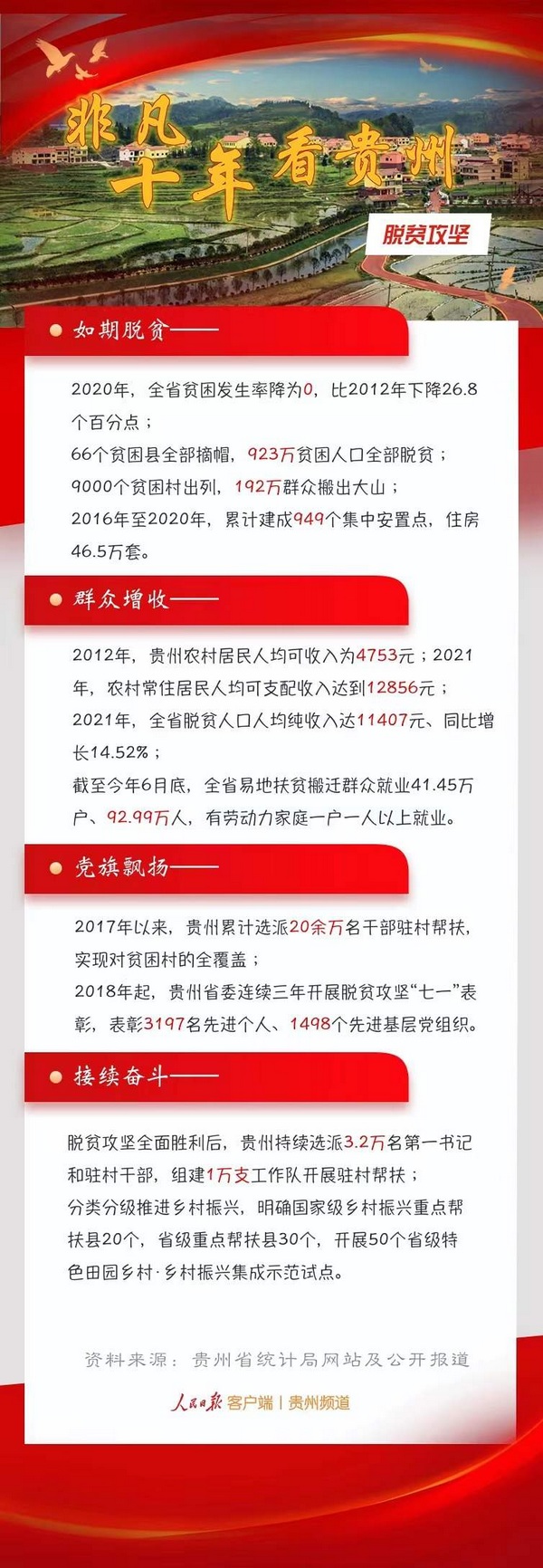 興產業,923萬貧困人口全部脫貧。貴州堅持將產業扶貧作為關鍵工作,通過“來一場振興農村經濟的深刻的產業革命”,因地制宜發展茶葉、辣椒、刺梨等12個農業特色優勢產業,為脫貧攻堅提供了有力支撐。2020年,12個農業特色優勢產業帶動2019年底全省剩余貧困人口30.83萬人中的28.56萬人增收,占92.6%。2020年,全省貧困發生率降為0,比2012年下降26.8個百分點。2012年,貴州農村居民人均可收入為4753元,2021年,農村常住居民人均可支配收入達到了12856元。