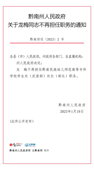 黔南州人民政府關于龍梅同志不再擔任職務的通知