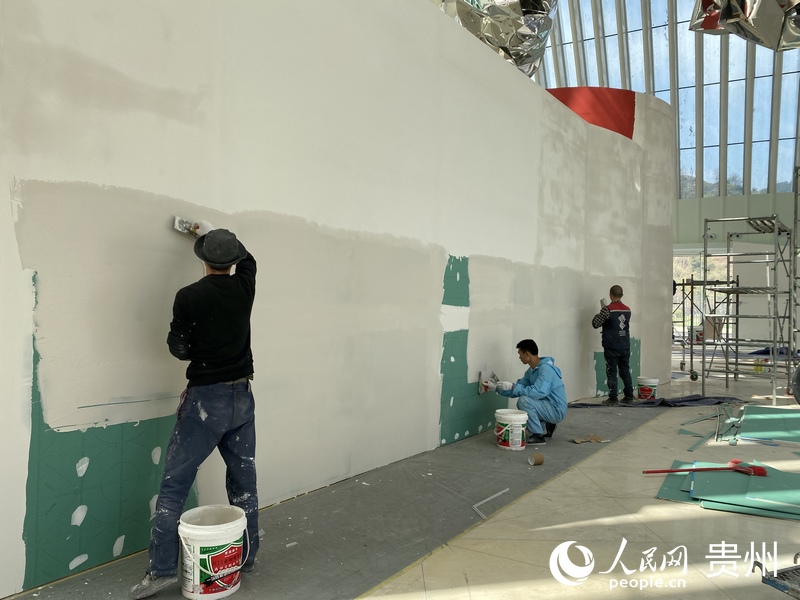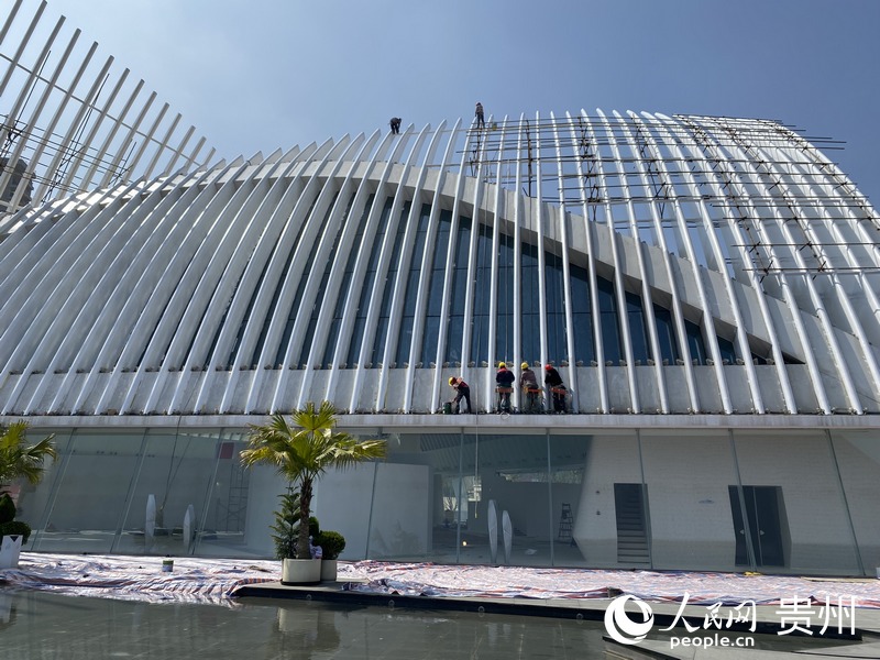 施工現場,貴陽國際時尚發布中心的裝修和布展正在有條不紊的進行中,目前外立面裝修已經完成,工人們正在進行場地的清理。擺放裝置藝術的一樓展區,三座西班牙建筑的微縮模型正在搭建,其中包括最出名的菲格拉斯達利博物館,它們將在26號完工亮相。