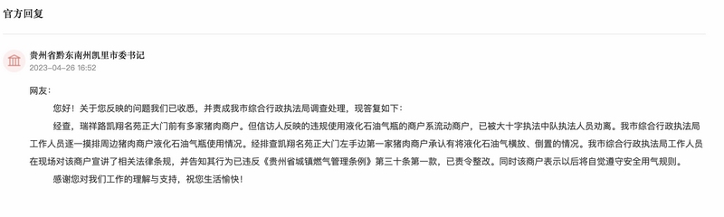 人民網貴陽4月27日電? (陳潔泉)4月26日,貴州省黔東南州凱里市就網友通過人民網“領導留言板”反映的“發現占道經營商戶將液化氣罐倒放存在安全隱患”的問題進行了辦理回復,稱已將該商戶勸離,同時對該區域進行逐一摸排并責令整改。