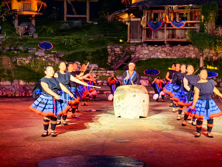 天色漸晚,村民們在演出場擺起長桌宴,用當地新鮮的食材制作而成的菜品散發出濃郁香氣,特別是鮮嫩可口的瑤山雞,再配上一杯甜潤的米酒,充滿地域特色的風味美食令游客們欲罷不能。酒足飯飽之際,一陣聲響傳來,《瑤山·瑤人》實景演出開始上演,獵槍舞、瑤浴舞、銅鼓舞等瑤族民俗節目輪番登場,讓大伙體驗著視覺和舌尖的雙重盛宴。