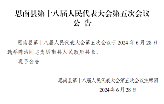 思南縣人民代表大會選舉陳浩為縣人民政府縣長