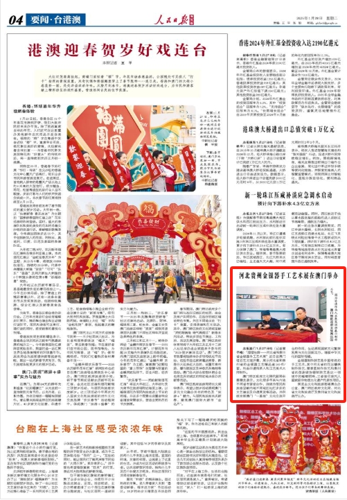 本報澳門1月27日電(記者富子梅)“熠熠生輝——河北省和貴州省金銀器手工藝術展”近日在澳門塔石藝文館開幕,展示河北省和貴州省的金銀器工藝精品逾160件/套,均由非遺傳承人和工藝美術大師制作。