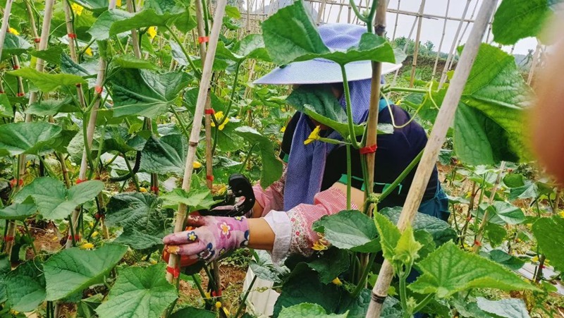 走進蔬菜產業基地,只見村民們穿梭在藤蔓間,手法嫻熟地采摘著成熟的黃瓜,臉上洋溢著豐收的喜悅。村民劉書靜說,她家就在附近,目前,黃瓜已陸續上市,來蔬菜基地幫種植大戶摘黃瓜很方便,一天能掙100余元,既能照顧孩子還能補貼家用。