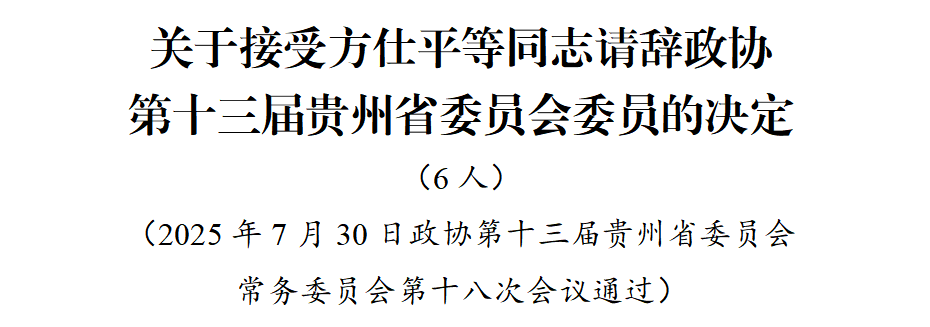 方仕平、陳堅、曾羽、魏明祿同志因達到任職年齡界限,劉曉星(女)、周勝華同志因個人原因,請求辭去政協第十三屆貴州省委員會委員。政協第十三屆貴州省委員會常務委員會第十八次會議通過:接受方仕平、劉曉星(女)、陳堅、周勝華、曾羽、魏明祿同志請辭政協第十三屆貴州省委員會委員。