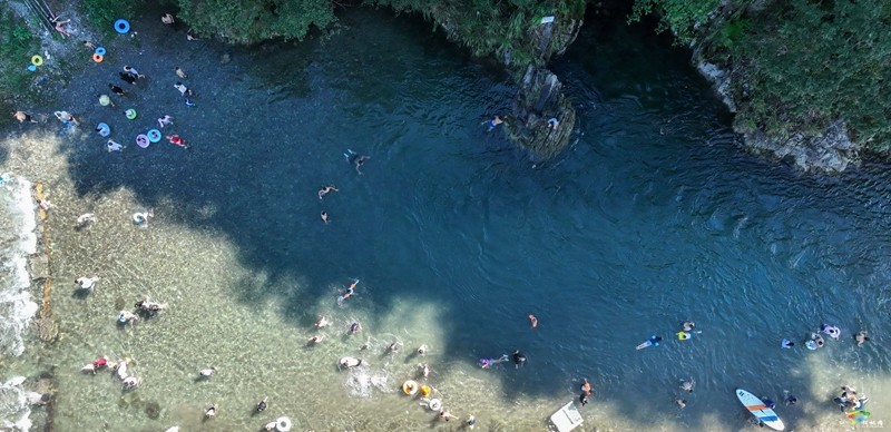 桃花源社區的水質好,全年平均氣溫在15.8℃,憑借獨特氣候和豐富水資源優勢,推出“避暑玩水”,暑期旅游熱度持續攀升。游客們在天然泳池中暢游,或在淺灘處燒烤歇涼,處處洋溢著夏日的清涼與歡樂。