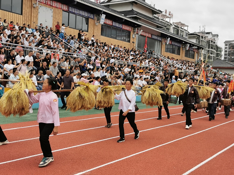 在分會場三寶侗寨又是另一番熱鬧景象,稻田里,渾水摸魚、打谷比賽、水田捕鴨、徒手抓豬等趣味農事活動引來陣陣歡笑。參賽者卷起褲腿,跳進水田,重現傳統農耕生活的場景。當地農民吳文勝抹去臉上的泥水,卷起褲腿,笑著說:“同慶豐收,活動樂趣多多!”